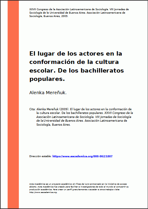 El lugar de los actores en la conformación de la cultura escolar. De los bachilleratos populares [recurso electrónico] / Alenka Mereñuk.