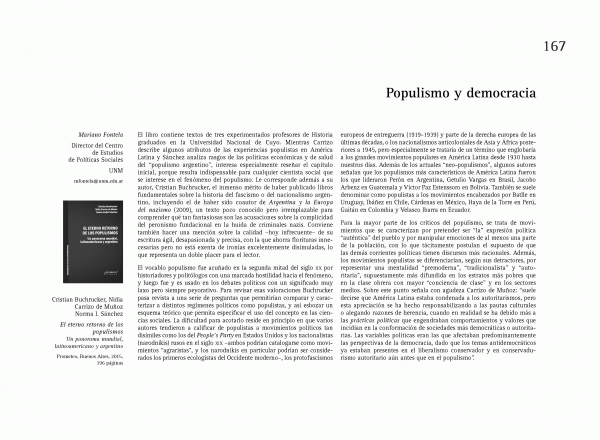 Reseña de la obra de : Cristian Buchrucker, Nidia Carrizo de Muñoz Norma I. Sánchez. El eterno retorno de los populismos. Un panorama mundial, latinoamericano y argentino. Prometeo, Buenos Aires, 2015, 196 página