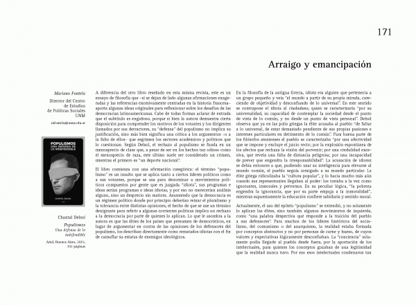 Reseña de la obra de : Chantal Delsol. Populismos. Una defensa de lo indefendible. Ariel, Buenos Aires, 2015, 192 páginas
