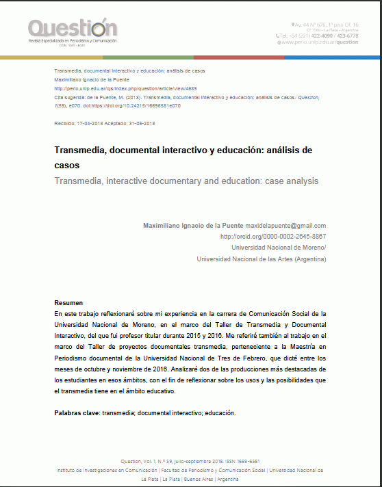 Transmedia, documental interactivo y educación [recurso electrónico] : análisis de casos = Transmedia, interactive documentary and education: case analysis / Maximiliano Ignacio de la Puente.