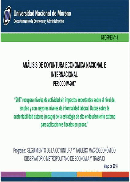 Análisis de coyuntura económica nacional e internacional [recurso electrónico] : período IV-2017: "2017 recupera niveles de actividad sin impactos importantes sobre el nivel de empleo y con mayores niveles de informalidad laboral. Dudas sobre la sustentabilidad externa (repago) de la estrategia de alto endeudamiento externo para aplicaciones fiscales en pesos" / Universidad Nacional de Moreno.