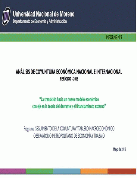 Análisis de coyuntura económica nacional e internacional [recurso electrónico] : período I-2016: "La transición hacia un nuevo modelo económico con eje en la teoría del derrame y el financiamiento externo" / Universidad Nacional de Moreno.