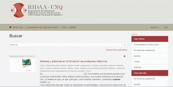 RIDAA-UNQ es el Repositorio Institucional Digital de Acceso Abierto de la Universidad Nacional de Quilmes, donde se almacena, organiza, gestiona, preserva y difunde la producción científica, académica, artística y cultural en formato digital, generada por los integrantes de la comunidad universitaria. Tiene por objeto permitir una mayor visibilidad de las creaciones de la Universidad, incrementar su uso e impacto y asegurar su acceso y preservación a largo plazo.