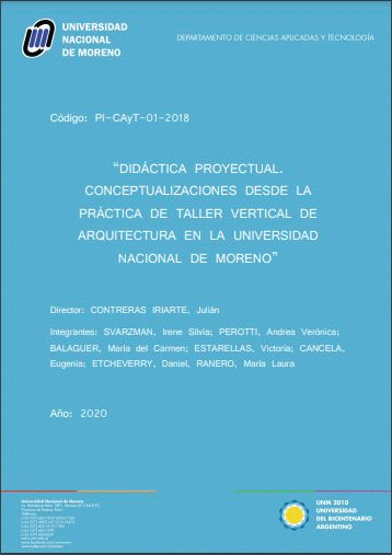 Didáctica proyectual. Conceptualizaciones desde la práctica de taller vertical de arquitectura en la Universidad Nacional de Moreno [recurso electrónico] / dirección, Julián Contreras Iriarte; integrantes, Irene Silvia Svarzman, Andrea Verónica Perotti, María del Carmen Balaguer, Victoria Estarellas, Eugenia Cancela, Daniel Etcheverry, María Laura Ranero.