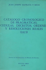 Catálogo cronológico de las pragmáticas, cédulas, decretos, órdenes y resoluciones reales generales emanados después de la Recopilación de las Leyes de Indias / Juan Joseph Matraya y Ricci ; advertencia preliminar, José M. Mariluz Urquijo.