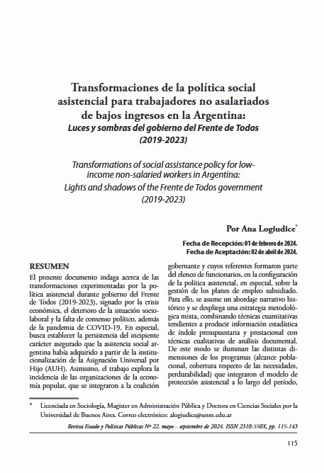 Transformaciones de la política social asistencial para trabajadores no asalariados de bajos ingresos en la Argentina [recurso electrónico] : luces y sombras del gobierno del Frente de Todos (2019-2023) / Ana Gabriela Logiudice.