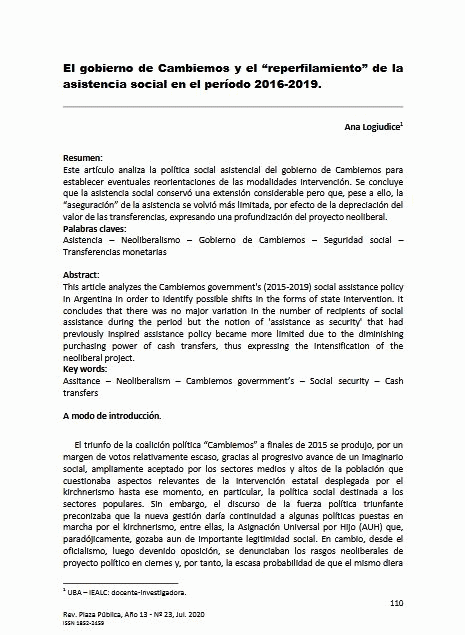 En: Revista Plaza Pública, Año 13, No 23 (Jul. 2020) Buenos Aires : 2020. p. 110-133.Resumen: Este artículo analiza la política social asistencial del gobierno de Cambiemos para establecer eventuales reorientaciones de las modalidades intervención. Se concluye que la asistencia social conservó una extensión considerable pero que, pese a ello, la "aseguración" de la asistencia se volvió más limitada, por efecto de la depreciación del valor de las transferencias, expresando una profundización del proyecto neoliberal. Abstract: This article analyzes the Cambiemos government's (2015-2019) social assistance policy in Argentina in order to identify possible shifts in the forms of state intervention. It concludes that there was no major variation in the number of recipients of social assistance during the period but the notion of 'assistance as security' that had previously inspired assistance policy became more limited due to the diminishing purchasing power of cash transfers, thus expressing the intensification of the neoliberal project. A modo de introducción. El triunfo de la coalición política "Cambiemos" a finales de 2015 se produjo, por un margen de votos relativamente escaso, gracias al progresivo avance de un imaginario social, ampliamente aceptado por los sectores medios y altos de la población que cuestionaba aspectos relevantes de la intervención estatal desplegada por el kirchnerismo hasta ese momento, en particular, la política social destinada a los sectores populares. Sin embargo, el discurso de la fuerza política triunfante preconizaba que la nueva gestión daría continuidad a algunas políticas puestas en marcha por el kirchnerismo, entre ellas, la Asignación Universal por Hijo (AUH) que, paradójicamente, gozaba aun de importante legitimidad social. En cambio, desde el oficialismo, luego devenido oposición, se denunciaban los rasgos neoliberales de proyecto político en ciernes y, por tanto, la escasa probabilidad de que el mismo diera 1 UBA-IEALC: docente-investigadora.
