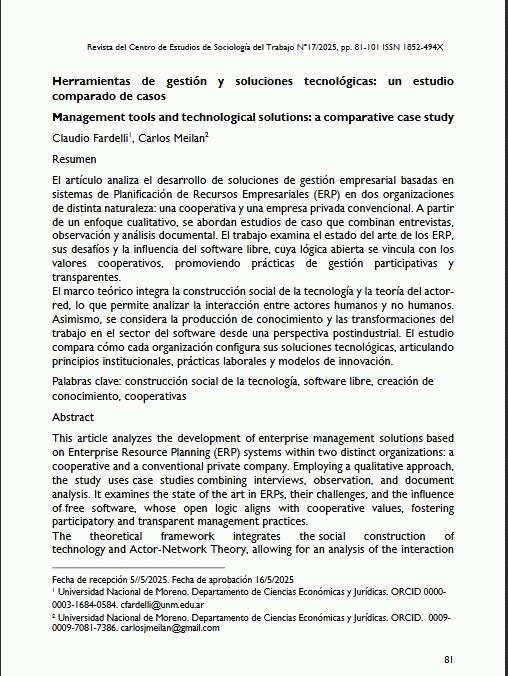 El artículo analiza el desarrollo de soluciones de gestión empresarial basadas en sistemas de Planificación de Recursos Empresariales (ERP) en dos organizaciones de distinta naturaleza: una cooperativa y una empresa privada convencional. A partir de un enfoque cualitativo, se abordan estudios de caso que combinan entrevistas, observación y análisis documental. El trabajo examina el estado del arte de los ERP, sus desafíos y la influencia del software libre, cuya lógica abierta se vincula con los valores cooperativos, promoviendo prácticas de gestión participativas y transparentes.