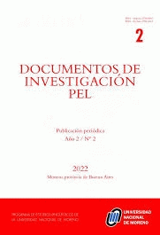 DOCUMENTO DE INVESTIGACIÓN PEL será un espacio en el que se dará cuenta de los resultados –parciales o totales– de las investigaciones radicadas en el programa y de las producciones de los docentes-investigadores, además de la publicación de artículos surgidos de eventos organizados desde el programa en la UNM, así como también volúmenes monográficos dedicados a temas específicos relacionados con las líneas de investigación prioritarias, convenios interinstitucionales, redes de cooperación, entre otros. Es nuestro objetivo sostener este espacio para visibilizar la producción del PEL y establecer vínculos con otros investigadores e instituciones.